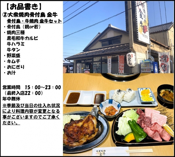 ②大衆焼肉骨付鳥金牛 骨付鳥・牛焼肉金牛セット 電話:0877-89-9877