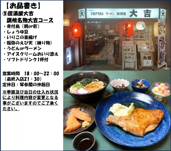 ⑤居酒屋大吉 讃岐名物大吉コース 電話:0877-75-1000(琴参閣代表番号)
