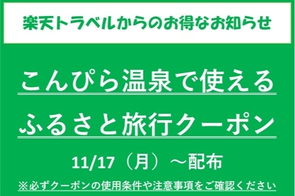 楽天トラベルより、本日11月17日(月)に配布されますこんぴら温泉で使えるお得なクーポンについて、ご紹介いたします。
